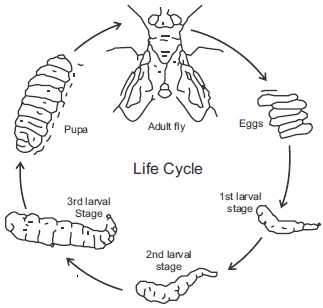 2a. The diagram above is the life cycle of a house fly, state how this knowledge can be used to control this disease