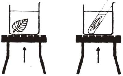 Dip the leaf in a hot alcohol, which is contained in a test tube being boiled by water bath as shown. Caution - Because of the