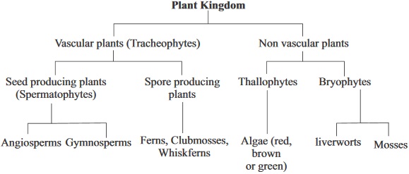 In the taxonomy of living things (i.e. Science of biological classication), plants are divided into vascular and non vascular plants.