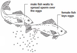 External Fertilization: External fertilization in Vertebrates involves, the female laying eggs into surrounding water and the males ejecting sperms over them outside the females body.